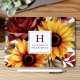 Dieses rustikale Design besticht durch einen blumengeschmückten Blumenstrauß in Aquarelltönen und eine bordeauxfarbene Rose. Passen Sie es an mit dem Monogramm-Initial und dem Namen in bordeauxfarbenem Serif-Schriftart, gerahmt von einem weißen Quadrat.