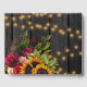 Rustikales Land Vintag traditionelles personalisiertes Gästebuch mit großen goldgelben Sonnenblumen, rot bordeauxroten Marsala-Rose, Saiten mit bunten Lichtern auf einem dunkelbraunen Holzboden und mit einer eleganten goldenen Typografie-Schrift. +++++++++++++ Ideal für Herbst- oder Sommerherbst | elegantes Vintages rustikales Land | Hochzeitsfeiern im Garten im Garten.