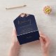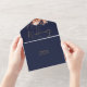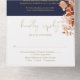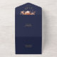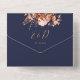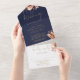 Einladende Hochzeitseinladung mit rustikalen Blumen und eleganter goldkalligraphischer Schriftzeichen auf marinebasischem Hintergrund. Die Einladung enthält zusätzliche Gastdetails und eine perforierte RSVP-Karte, die für Sie individuell adressiert oder verlassen werden kann, damit Sie die Adressdaten Ihres Gastes handschreiben können. Entwickelt von Thisisnotme©
