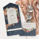 Eine wunderschöne Herbsthochzeit mit ihren Namen in Kalligraphie-Schriftzeichen, eingebettet in einen Bogen von Aquarellfarben-Blume und Botanicals in abgedämpften Erdtönen wie Bordeaux-Marsala, Rose, Elfenbein und Salbei-Grün. Personalisieren Sie Ihre Hochzeitsdetails unten. Die beiliegende RSVP-Karte und der Faltstil machen diese Einladung zu einer ansprechenden Wahl.