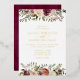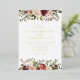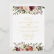 Elegante blumengeschmückte Hochzeitsfeiern oder Herbst- oder Winterhochzeiten in luxuriösen Goldfolien-Schriften, die von den obersten und unteren Rändern der Aquarellfarben Rose, Mums und Grün in rustikalen Herbstfarben wie Pfirsich, Elfenbein, Rose, Bordeaux und Grün hervorgehoben werden. Die Karten werden in ein subtil gemotztes, tiefes Cabernet umgeschaltet.