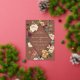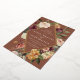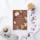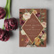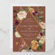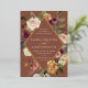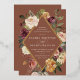 Elegante blumengeschmückte Hochzeitsfeiern oder Herbst- oder Winterhochzeiten prägen die Details, die in einem lang gestreckten Diamanten eingebettet sind, umgeben von Aquarellfarben, Rose, Mums und Grün in rustikalen Herbstfarben wie Pfirsich, Elfenbein, Rot, Bordeaux und Grün auf einem reichen Terrakotta Rost Hintergrund. Die Goldfolienbespannung rundet das Design ab.