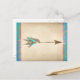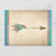 Ein rustikaler Pfeil mit floraler und türkisfarbener Feder, der vor einem konturierten beigen Hintergrund abflockt, mit bunten neonistischen Stammesmustern.