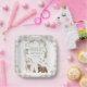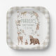 Süße geschlechtsneutrale Waldtiere-Themen-Babyparty-Papier-Teller mit verschiedenen Waldtieren, Schmetterlingen, Bogen und Kranz.