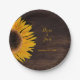 Rustikales Hochzeitsland braunes Holzkorn Gelb Sonnenblumen Abendessen Empfang rund Papier Teller. Schönes, einfaches Blume Druckdesign. Bildrecht Marg Seregelyi Fotografie.