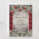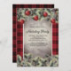 Rustikale und fett rote und schwarze Büffel kariert Holiday Partyeinladung mit einem grauen / silbernen Textraum. Umfasst einen schönen Kiefernzweig und rote Weihnachtsschmuck Akzente.