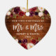Rustikales Holz, Moderne Pinselschrift, Watercolor Burgundy Marsala Floral, Unsere ersten Weihnachten als Mr. und Mrs. Heart Wedding Ornament
