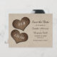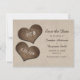 Rustikale Hochzeit auf dem Land Save the Date Fotokarten mit zwei Höhlenherzen auf einem hellen Burlton-Hintergrund. Benutzerdefiniertes Foto auf der Rückseite.