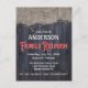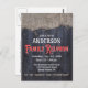 Eine rustikale Familienkarte mit Wiedersehen-Postkarteneinladung mit einem Burlap- und dunklen Holzmotiv. Die Rückseite hat Platz für spezielle Details und UAWG-Kontaktinformationen.