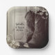 Fügen Sie Ihrem lässigen und dennoch eleganten Verlobung Stall Party, Brautparty oder Ehe Empfang eine charmante Touch hinzu, wenn Sie diese charmanten Rustikalen Cowboy Boots Floral Country Wedding Paper Teller personalisieren. Diese individuell gestalteten und eleganten Teller sind mit einem klassischen, digital verbesserten Schwarz-Weiß-Sepia-Tonfoto aus Leder-Cowboystiefel mit verwittertem Holzboden und weißen Blume an den Ecken gestaltet.