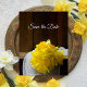 Ankündigen Sie Ihren März, April oder Mai Frühlingszeit ländlichen Bauernhof oder Ranch Stil Nuptials mit den charmanten rustikalen Daffodils und Barnholz Land Hochzeit Save the Date Postcard. Diese lässige und dennoch elegante thematische Ehe zum Thema Western behalte das Datum Postkarte zeigt ein malerisches Blumenfoto eines Strauß von gelben Narzissen Blume Blüten mit einem weißen Brautschleier und einem braunen Holzfußboden. Perfekte Inspiration für eine feierliche Party-Ehe im Stall und für die Feier zum Empfang.