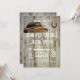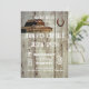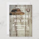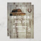 Eine Land-Hochzeitseinladung der coolen Typografieart rustikale mit rustikaler Landscheune an der obersten links Ecke und ein Hufeisen auf dem Recht. Der Hintergrund ist beunruhigter hölzerner Druckhintergrund der dunklen Scheune.