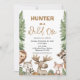 Rustikale Elche Woodland Wild Ein 1. Geburtstag Einladung Niedliche Waldhündin zum Geburtstag mit Elch, Wolf, Fuchs, Raccoon und Stachelschwein. Die Waldlandschaft zum 1. Geburtstag lädt auch zu einigen Kiefern und einer Waldlandschaft ein.