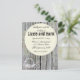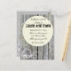 Rustikal graue, verwitterte Holzsteine bilden den Hintergrund dieser charmanten Hochzeit. Ein dekorativer Kranz aus Blume, Herzen und Spitzen schmückt den Kartenboden, und eine runde dekorative Kugel mit Blätter und Blume sind Kartenzentrum mit allen Informationen. Land schick in seiner schönsten Form.