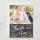 Dieses hübsche 1-Foto-Dankeschön-Kartenmaterial ist mit handgeschriebener Kalligraphie, rustikal-schicken Imitaten, goldenen Folie und einem Chalkboard-Hintergrund ausgestattet. Auf Wunsch können auf der Kartenrückseite zusätzliche Fotos oder Texte hinzugefügt werden.