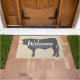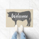 Graue große Stier-Silhouettefußmatte mit dem Wort "Willkommen" im weißen Text sowie im Ihrem Familiennamen. Fügen Sie etwas Art und Spaß Ihrem Eingang mit dieser eleganten rustikalen Landartfußmatte hinzu.