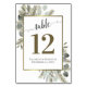 Machen Sie Ihren Hochzeitsempfang mit diesen Tischnummern schön. Sie zeichnen sich durch ein wunderschönes Design aus, das durch eine laksige Schriftzeichen-Kalligraphie umgeben ist, die von einer Fülle von Eukalyptus-Blätter und Kiefernästen in Weiß- und Goldtönen umgeben ist. Es gibt Platz für die Namen des Ehepaares und des Hochzeitstages sowie für die Tischnummer.