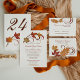 Im Herbstthema Hochzeitsfeierprogramm mit Elfenbeinhintergrund stehen elegante Rollen und Blätter in Herbstfarben. Personalisieren Sie den benutzerdefinierten Text für Ihr Brautparty, Zeremonie Informationen, und danken Sie Ihnen Nachricht. Hinweis: Diese Textgewichtspapierprogramme kommen flach an und müssen zum Zusammenbauen zusammengelegt werden.