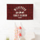 Rustikales, modernes Wiedersehen-Banner mit trendigem Waldgebirgsdesign mit Kiefernbäumen, Wäldern und Vögeln, umgeben von Ihrem eigenen Familiennamen auf bedrucktem, kariertem Büffel, einem personalisierbaren Namen Ihrer Feier, sowie dem Datum der Ansammlung.