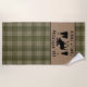 Ein schönes, rustikales Strandtuch mit Familienname und Hütte, Lodge, Hütte oder anderen Wunschtexten mit feststehendem Datum. Dieses einzigartige, individuell gestaltete Design besticht durch die Silhouette eines Bullenmoose und Pinienbäume auf einem Bretterprint, die mit einem wunderschönen französischen Land in sanften Grastönen und Salbei-Grün kariert sind. Um mehr Designs wie dieses zu sehen, besuchen Sie bitte meinen Shop hier unter "Zazzle.com/Rustic_Charm". Danke.