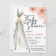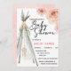 Eine bohobige, rustikale Einladung für eine Babydusche mit Aquarellfarben-Blume und ein Teepee mit einem hängenden Träumer. Eine schöne Einladung für eine böhmische Babydusche.