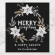 Dieses rustikale, blumengeschmückte Weihnachtsweinetikett macht das niedliche Urlaubserlebnis. Das Design zeichnet sich durch einen weißen und bräunlichen Kranz der Blume auf schwarzem Hintergrund aus, mit dem festlichen Satz "fröhlich alles und immer glücklich" und einem kleinen Herz. Personalisieren Sie das Label mit Ihrem Namen.