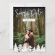 Eine zweiseitige Save the Date-Karte mit einem eigenen Foto auf der Vorderseite mit den Begriffen "Save the Date" und einem personalisierbaren Hochzeitstermin, das auf einer schlichten, weißen Bandform angezeigt wird. Der Rücken zeigt ein Waldlandschaft-Foto von Destei mit Platz für weitere Hochzeitsdetails. Eine Reihe von Tannenbaum-Silhouetten reiht den Boden ein und fügt eine waldreiche Touch hinzu. Diese elegante Karte verbindet persönliche Momente mit landschaftlicher Schönheit und eignet sich ideal für Wanderhochzeiten, Feiern im Freien und naturlich inspirierte Veranstaltungen.