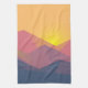 Küchenhandtuch mit grafischer Darstellung mit vielen Berggipfeln mit hellgelbem Sonnenlicht hinter den Bergen. Mit geometrischen polygonalen Formen gefertigt. Einfaches minimalistisches Design. Die Farben reichen von dunkelblau bis wüstenrot.
