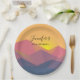 Geburtstagspapier-Teller mit einer grafischen Abbildung vieler Berggipfel mit hellgelbem Sonnenlicht hinter den Bergen. Mit geometrischen polygonalen Formen gefertigt. Einfaches minimalistisches Design. Die Farben reichen von dunkelblau bis wüstenrot.