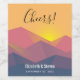 Hochzeitsflaschen-Etiketten mit einer grafischen Abbildung mit vielen Berggipfeln mit hellgelbem Sonnenlicht hinter den Bergen. Mit geometrischen polygonalen Formen gefertigt. Einfaches minimalistisches Design. Die Farben reichen von dunkelblau bis wüstenrot.