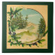 Ein Vintages rustikales Bild; eine Kreisvignette, die Berge und Nadelbaumbäume mit Schnee in den Niederlassungen umgeben durch ein Blumenmotiv kennzeichnet.