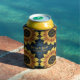 Rustikale Hochzeit gelbe Sonnenblumen Land denim blauen Jeans gedrucktes Bier kann kühler. Blumenmuster schöne Print-Design Getränkehalter. Bildrecht Marg Seregelyi Fotografie.