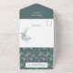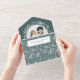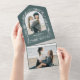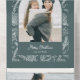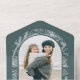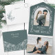 Dieses einzigartige Design enthält eine trendige, bogenförmige Fotovorlage mit einem weißen, gezeichneten winterlichen botanischen Rahmen auf einem salbeigrünen Hintergrund. Die Paneele enthalten ergänzende florale Grafiken, Textfelder und eine zusätzliche abreißbare Fotovorlage.