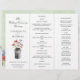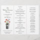 Dreifache Hochzeitsfeier mit einem rustikalen Aquarellbukett handgepflückter Blume in einem Milcheimer. Auf der Rückseite des Programms befindet sich ein grüner sommerlicher Aquarellspülhintergrund mit einer Wiese von Blume, Blumen wie Mohn, Maisblumen und Gras. Bitte beachten Sie: Wenn Sie den Papiertyp ändern, kann es schwierig sein, das Programm zu falten.