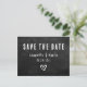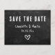 Eine maßgeschneiderte rustikale Chalkboard-Hochzeit speichert die Datums-Postkarten mit einem schwarzen Chalkboard-Hintergrund mit den Hochzeitsdetails und einem niedlichen Herz.