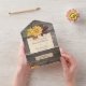 Ihr Hochzeitstag ist ein Fest der Liebe und der Schönheit der sich verändernden Jahreszeiten der Natur. Diese Einladung zur All-in-One Hochzeit vereint den rustikalen Charme des Holzes, den Zauber der Herbstblätter und die Eleganz der goldenen Chrysanthemen, um eine wirklich faszinierende und herzliche Einladung für Ihren besonderen Tag zu schaffen. Die All-in-One Hochzeitseinladungen sind schön und praktisch, indem sie die Hochzeitseinladung mit einer leicht zu entfernenden perforierten UAWG-Postkarte kombinieren. Sie sind auch schnell und einfach für den Versand vorbereitet. Einfach auf die Einladung richten, die Rückenklappe und das Siegel mit den beiliegenden Klarsichtstickern falten. Sobald Ihre Gäste die voradressierte Einladung erhalten, reißen sie einfach die perforierte RSVP-Karte ab und lassen sie in der E-Mail ablegen.