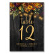 Rustikale Tischnummer für Hochzeitsfeiern mit bearbeitbarem Text mit fallbotanischen Schriftzeichen auf dunkelbraunem Stallholzhintergrund mit Saitenbeleuchtung. Ideal für Ihren Sommer oder Herbst Herbst Garten Garten Garten im Freien oder Bauernhof Hochzeit.