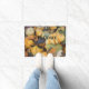 Ein Herbstthema Willkommen Türmatte mit einem Foto von bunten Göttern. Fügen Sie Farbe und Lustigkeit zu Ihrer Haustür, um die Gäste in diesem Herbst willkommen zu heißen.