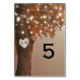 Vintage Herbsthochzeiten Tischnummern mit einem rustikalen Baum mit verbrannten orangen Blätter, einem geschnitzten Herz mit den Paarinitialen, Saitenleuchten und Ihrer Tischnummer.