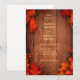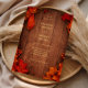 Ein warmes und einladendes Design mit einem natürlichen Holzuntergrund, gerahmt von lebendigen Herbstblättern und saisonalen Akzenten. Die Komposition verbindet rustikale Texturen mit reichen orangefarbenen und roten Tönen und schafft einen gemütlichen und organischen visuellen Stil. Die natürlichen Elemente und die erdige Farbpalette rufen eine zeitlose und charmante Atmosphäre hervor.