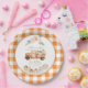 Diese zauberhafte Papiertafel bringt Ihnen alle gemütlichen Eindrücke einer Herbstfeier an Ihren Tisch. Ein klassischer karierter Büffel in Orange und Weiß umrahmt eine wunderschöne Aquarelllandschaft mit einem rustikalen Vintagen LKW, der mit Kürbissen überflutet ist. Elegante Blumenakzente und sanfte Schriftart vervollständigen das Aussehen und machen es zum perfekten Geschirr für Ihre Herbstdusche. Es ist eine bezaubernde Art, Leckereien zu servieren und die Ankunft Ihres kleinen Kürbiss stilvoll zu feiern.