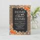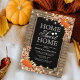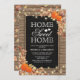 Rustikale Party Einladungen mit einem rustikalen Holzhintergrund, schwarzem Kalkbrettkern, Seil, Halloween Kürbis, Laub, Eicheln, Herbstblätterstreuung, Schnürsenkel beleuchten das niedliche Sprichwort "Zuhause Sweet Zuhause" und eine personalisierte Party Einladung Textvorlage.