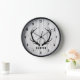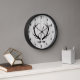 Diese Uhr zeigt schwarze Hirschgeweihe über einem Imitat-Holzputz-Hintergrund für einen rustikalen Bauernausblick