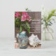 Eine rustikale Hochzeit am Strand mit einem Foto aus einer blauen Muscheldose, einer Vase aus rosa tropischen Blume und einer großen Muschel, die auf einer Einbruchfläche auf einem rustikalen Holzboden sitzt.