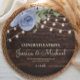 Rustikale, dunkelbraune Teller aus Hochzeitspapier mit glitzernden Saitenlampen und periwinkelblauen Aquarellfarben. Personalisiert mit den Namen der Braut und des Bräutigams und dem Hochzeitstag. Kontaktieren Sie uns für Hilfe bei der Anpassung und der Anpassung der Produkte.
