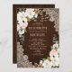 Mit diesem Design, das Vintage Spitzen, weiße und rosa Aquarellblumen mit Magnolien, Baumwolle und Eukalyptus auf einem Stallholzhintergrund bietet, schaffen Sie die perfekte Rustikale Hochzeitseinladung. Copyright Elegant Invites, alle Rechte vorbehalten.