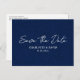 Minimalistische marineblaue rustikale Hochzeit speichern das Datum Postkarte mit marineblau Hintergrund.