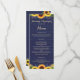 Dieses rustikale Landdesign besticht durch goldene Saitenlichter und Spitzen, Sonnenblumen und Lavendelsprigs vor einem marineblauen Holzhintergrund. Der Text mit anpassbaren Braut- und Bräutigam-Namen und Veranstaltungsdetails erscheint in blassem Gold in beliebter Schrift- und Serifentypografie. Sie können dieses Menü für Ihre eigene Hochzeit personalisieren, indem Sie den Text in der Vorlage ändern.
