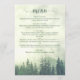 Dieses rustikale Hochzeitsmenü umfasst einen kalligraphischen Schriftzeichen und eine wilde Bergszene mit grünen Pinienbäumen, die in Nebel oder Nebel verschlungen sind. Die Rückseite hat Platz für die Namen des Paares und das Hochzeitstag. Ideal für einen Empfang im Freien.