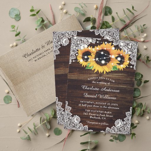 Eine maßgeschneiderte Hochzeit mit rustikalen Sonnenblumen bewahrt die Dattelkarten mit Sonnenblumen vor einem rustikalen Holzhintergrund, der mit Lichtern und weißen Blumenspitzen geschmückt ist. Unsere Sonnenblumen Hochzeit speichern die Terminkarten sind perfekt für ein rustikales Land, oder Scheune Hochzeitsfeier inspiriert von Sonnenblumen Blume.